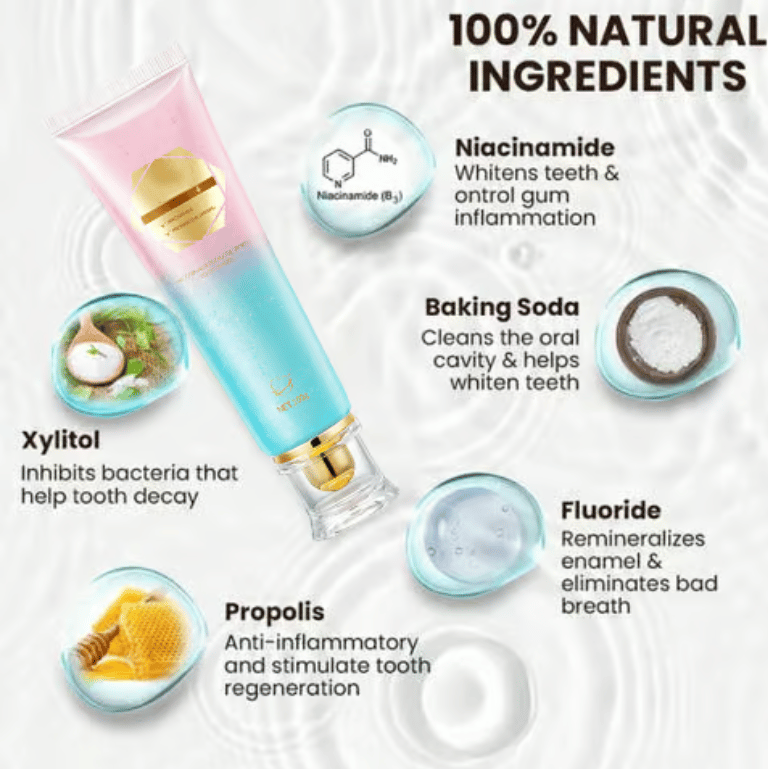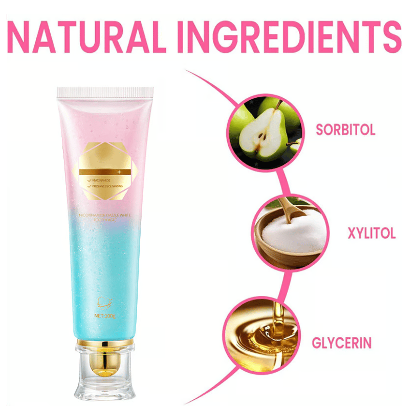 - 🌟 Niacinamide (Vitamin B3): Helps whiten teeth by inhibiting melanin production, reduces inflammation, and promotes healthier gums.